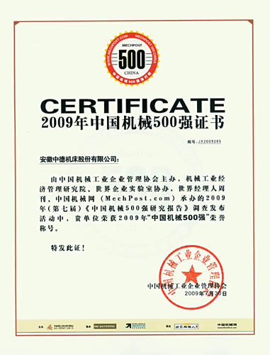由中國機(jī)械工業(yè)企業(yè)管理協(xié)會(huì)主辦,機(jī)械工業(yè)經(jīng)濟(jì)管理研究院、世界企業(yè)實(shí)驗(yàn)室協(xié)辦,世界經(jīng)理人周刊、中國機(jī)械網(wǎng)承辦的2009年(第七屆)《中國機(jī)械500強(qiáng)研究報(bào)告》調(diào)查活動(dòng)公布,中德機(jī)床榮獲2009年“中國機(jī)械500強(qiáng)”。