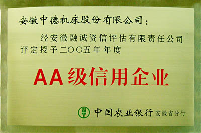 日前,經(jīng)安徽融誠資信評估有限責任公司評定,安徽中德機床股份有限公司再次被中國農(nóng)業(yè)銀行安徽省分行授予二00五年年級AA級信用企業(yè)。