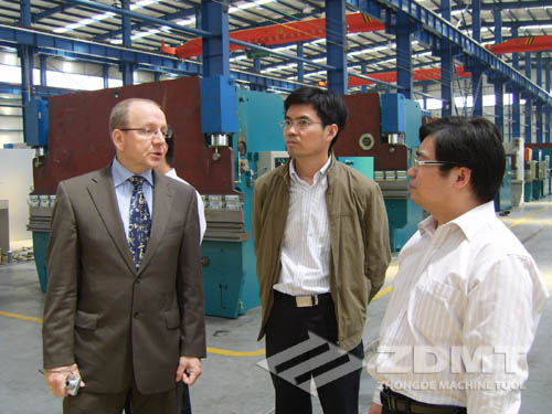 在整個(gè)的參觀過(guò)程里, EDWIN先生了解了我們先進(jìn)的工廠全程監(jiān)控系統(tǒng),寬敞明亮的工作車間以及外形簡(jiǎn)潔優(yōu)雅的產(chǎn)品。相信在韓總流暢的英文翻譯下,EDWIN先生一行對(duì)本地區(qū)剪折行業(yè)的發(fā)展?jié)摿σ欢ㄓ辛诵碌恼J(rèn)識(shí)。同時(shí),我們很感謝韓總和EDWIN先生,他們站在一個(gè)全新的角度,對(duì)中德機(jī)床提出了建設(shè)性的建議。我們也希望中德機(jī)床精益求精,同ESTUN公司和DELEM產(chǎn)品建立更緊密的關(guān)系,將中德機(jī)床推向更廣闊的市場(chǎng)。