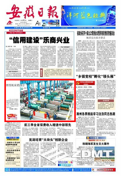 今日(2009年11月11日)《安徽日?qǐng)?bào)》頭版刊載《博望機(jī)床銷四方》的圖片新聞報(bào)道。在我公司大型車間圖片中,配出如下文字報(bào)道:11月6日,位于當(dāng)涂縣博望鎮(zhèn)的民營企業(yè)安徽中德機(jī)床股份有限公司生產(chǎn)車間里一片繁忙。該企業(yè)今年前三季度銷售量同比增長(zhǎng)35%,產(chǎn)品出口30多個(gè)國家和地區(qū)。(特約攝影 謝富樂)
